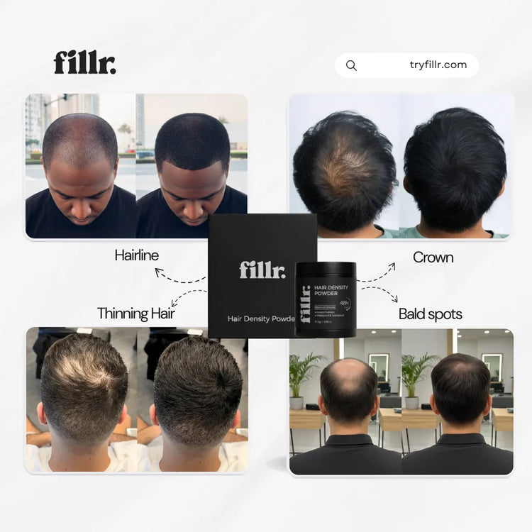 Fillr® conceals thinning patches in just 10 seconds, delivering a fuller, natural look. Waterproof and sweat-proof for up to 48 hours, it easily rinses out with your regular shampoo.